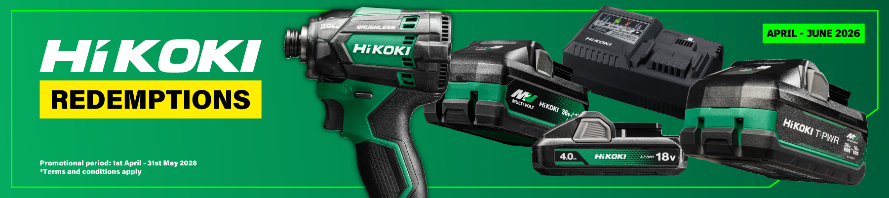 Claim a FREE HiKOKI battery, charger, or tool when you purchase selected HiKOKI products within this category as part of the HiKOKI Redemption Offers. This promotion is valid from the 1st of April until 31st May 2026.
